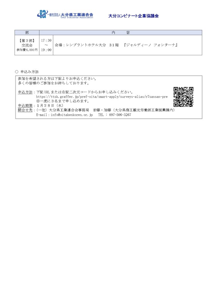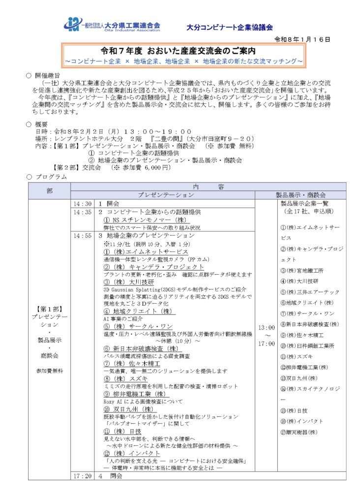 本交流会は、大分コンビナート企業協議会および大分県工業連合会が主催する、コンビナート企業と地場技術企業の連携促進を目的とした技術交流イベントで、当日は製造業・プラント関連企業を中心に数百名規模の参加がありました。