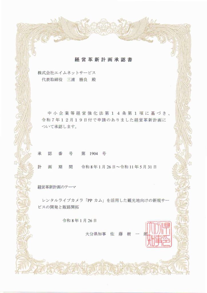 この度、株式会社エイムネットサービスは、大分県知事より「経営革新計画」の承認をいただきましたことをご報告いたします。